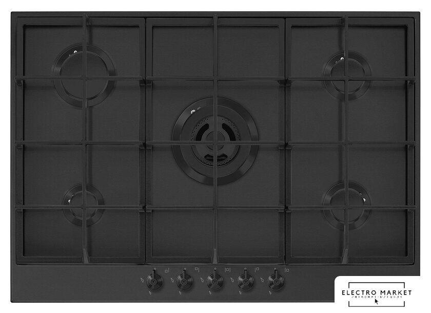 газовая на 5 конфорок, закаленное стекло, мощность: 11300 Вт, автоматический электроподжиг, газ-контроль, решетки: чугун, независимая установка, размеры (ШхГ): 75x51 см