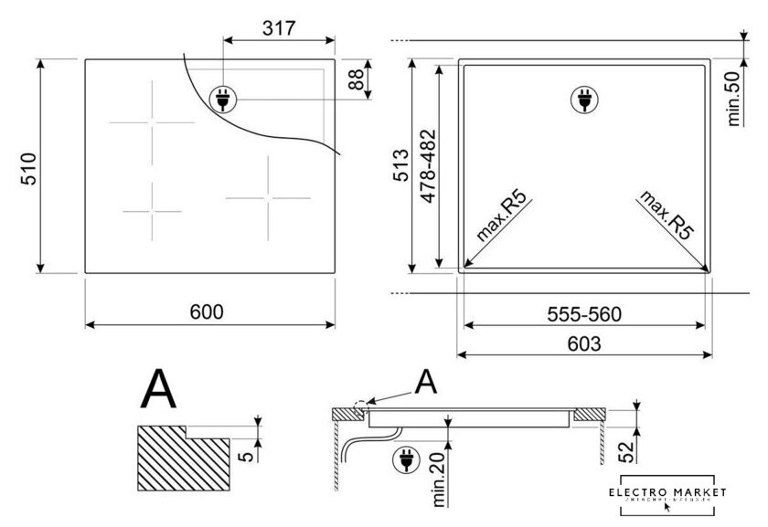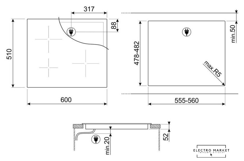 индукционная на 4 конфорки, cтеклокерамика, мощность: 7400 Вт, независимая установка, размеры (ШхГ): 59x52 см
