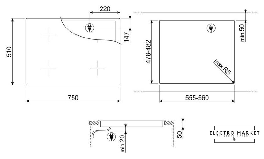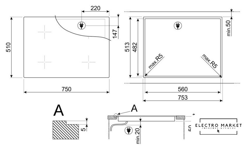 индукционная на 5 конфорок, cтеклокерамика, мощность: 7400 Вт, независимая установка, размеры (ШхГ): 80x52 см