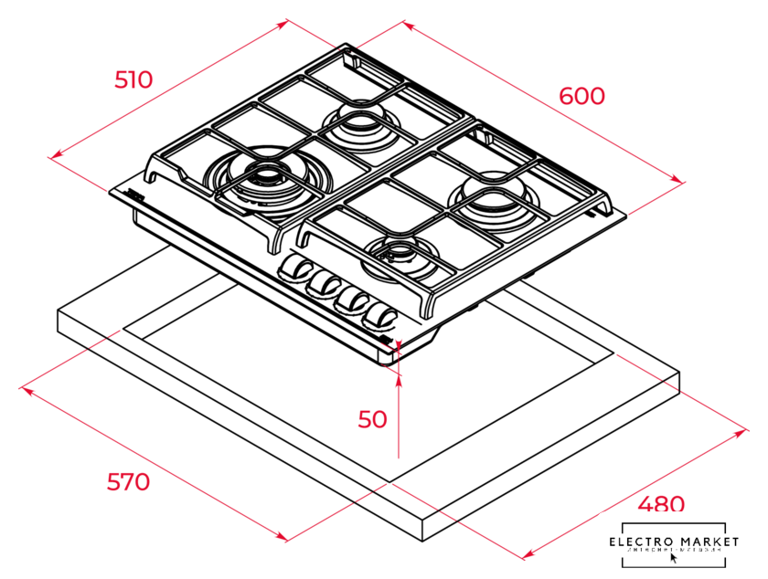 газовая на 4 конфорки, cтеклокерамика, мощность: 9550 Вт, автоматический электроподжиг, газ-контроль, решетки: чугун, независимая установка, размеры (ШхГ): 60x51 см