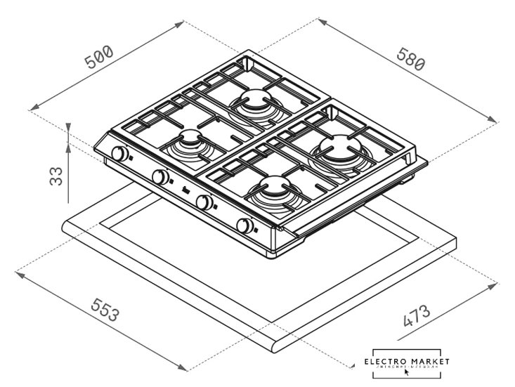 газовая на 4 конфорки, закаленное стекло, мощность: 8150 Вт, автоматический электроподжиг, газ-контроль, решетки: чугун, независимая установка, размеры (ШхГ): 58.5x51 см