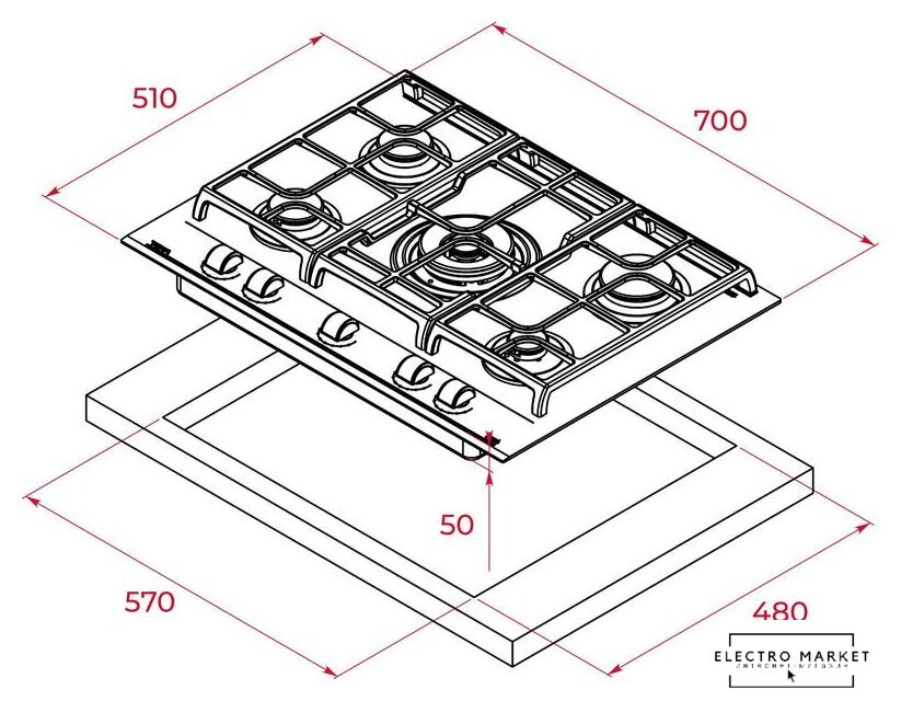 газовая на 5 конфорок, нержавеющая сталь, автоматический электроподжиг, газ-контроль, решетки: чугун, независимая установка, размеры (ШхГ): 70x51 см