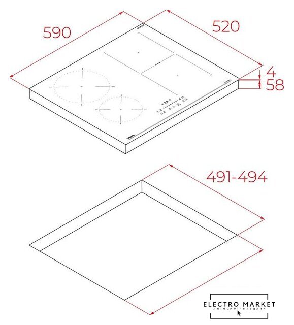 индукционная на 4 конфорки, закаленное стекло, мощность: 7200 Вт, независимая установка, размеры (ШхГ): 59x52 см