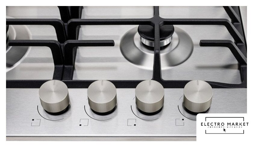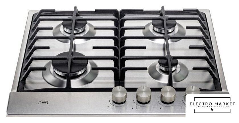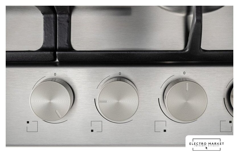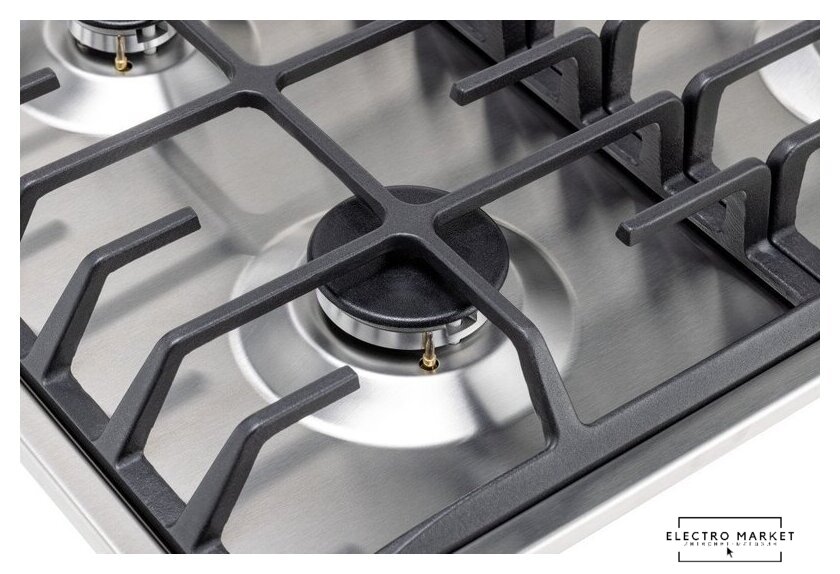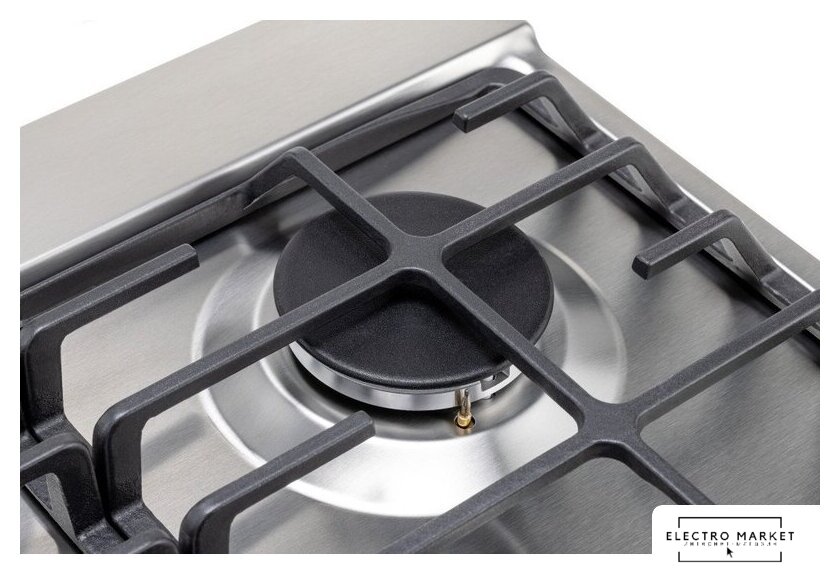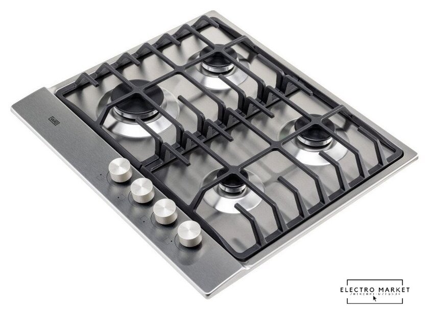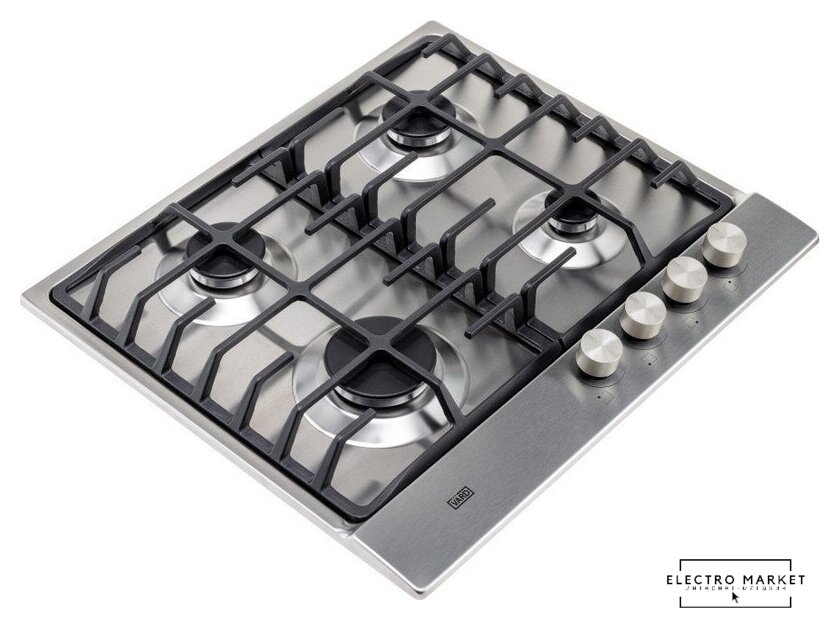 газовая на 4 конфорки, нержавеющая сталь, мощность: 9550 Вт, автоматический электроподжиг, газ-контроль, решетки: чугун