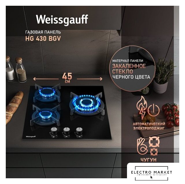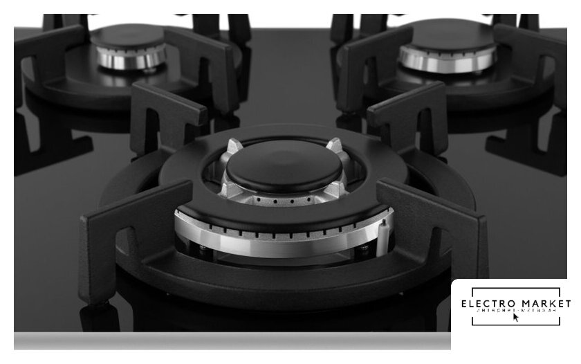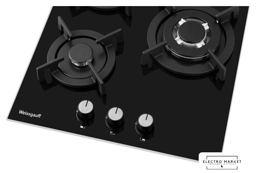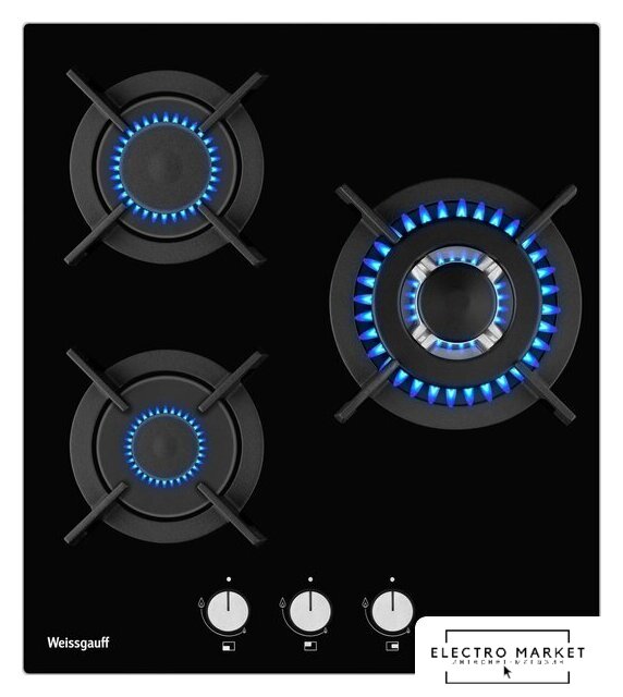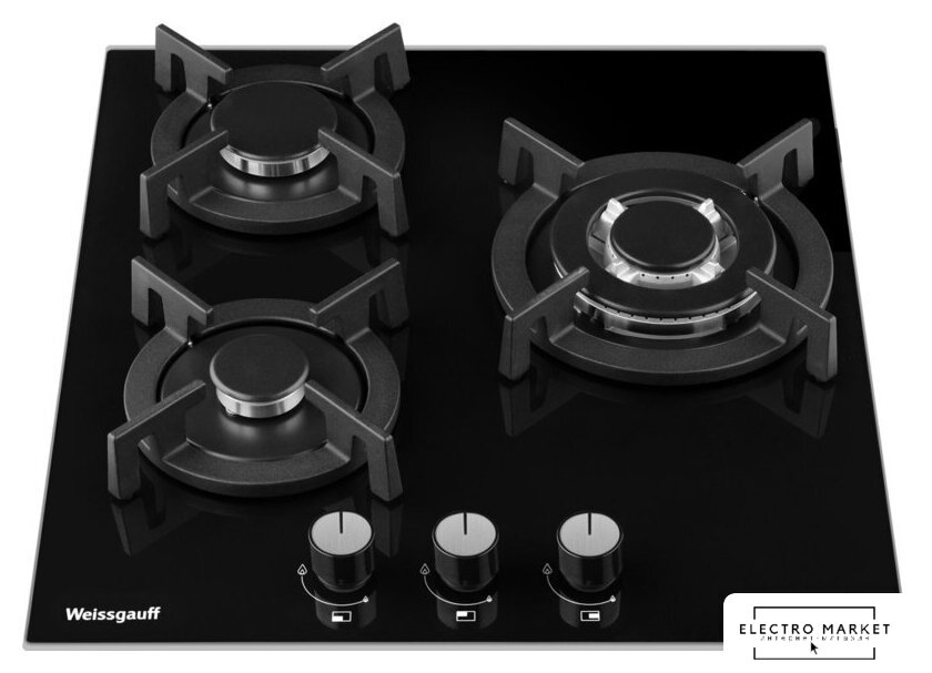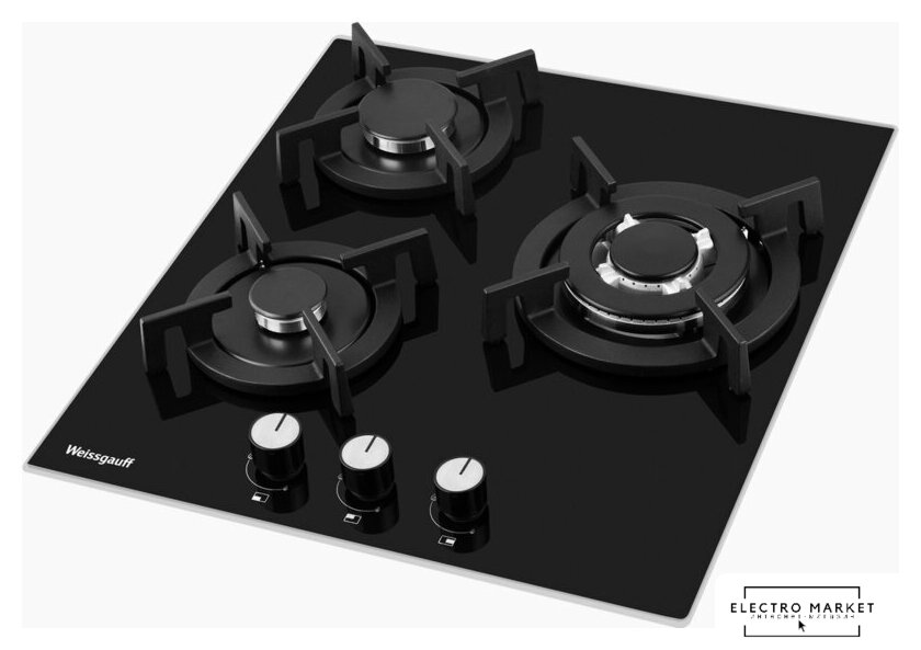 газовая на 3 конфорки, закаленное стекло, мощность: 6050 Вт, автоматический электроподжиг, газ-контроль, решетки: чугун, независимая установка, размеры (ШхГ): 45.3x51 см