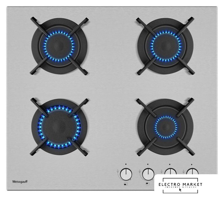 газовая на 4 конфорки, нержавеющая сталь, мощность: 9100 Вт, автоматический электроподжиг, газ-контроль, решетки: чугун, независимая установка, размеры (ШхГ): 59x51.5 см