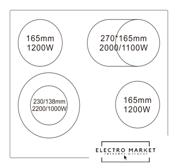 Подробная информация о конфорках | 2x165 мм (1200 Вт)1x165x270 мм (1100/2000 Вт)1x138-230 мм (1000-2200 Вт) |