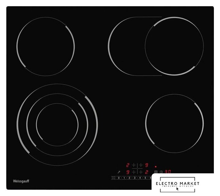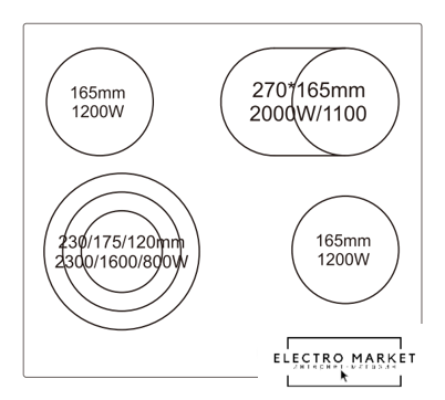| Подробная информация о конфорках | 2x165 мм (1200 Вт)1x165x270 мм (1100/2000 Вт)1x120-175-230 мм (800-1600-2300 Вт) |
