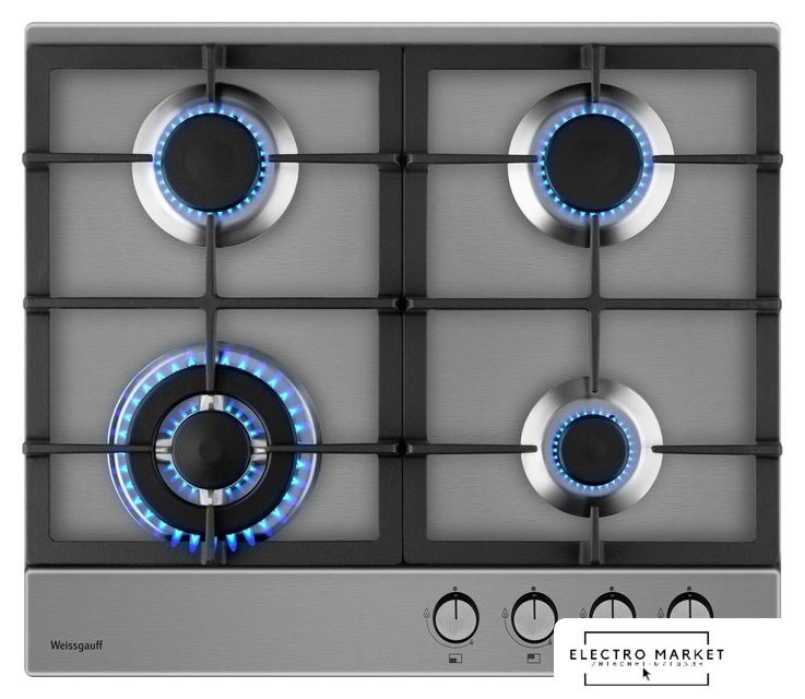 газовая на 4 конфорки, закаленное стекло, мощность: 8000 Вт, автоматический электроподжиг, газ-контроль, решетки: чугун, независимая установка, размеры (ШхГ): 58x50 см