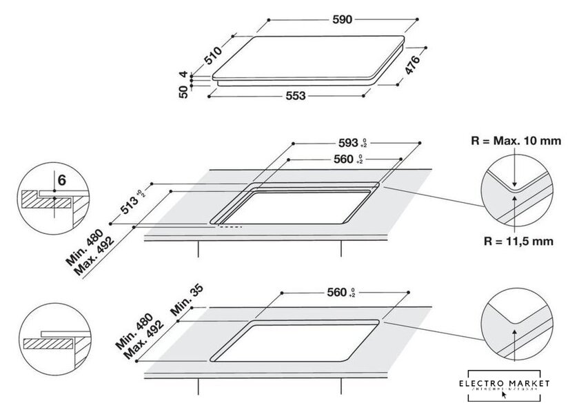 индукционная на 4 конфорки, закаленное стекло, мощность: 7000 Вт, независимая установка, размеры (ШхГ): 59x52 см