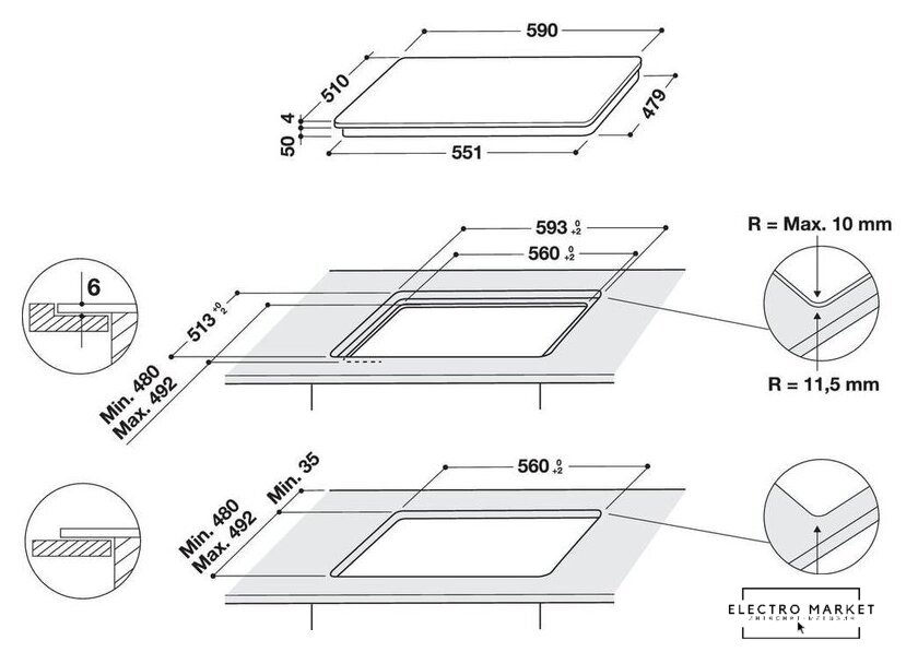 индукционная на 4 конфорки, cтеклокерамика, мощность: 7400 Вт, автоматика закипания, независимая установка, размеры (ШхГ): 59.5x52.5 см