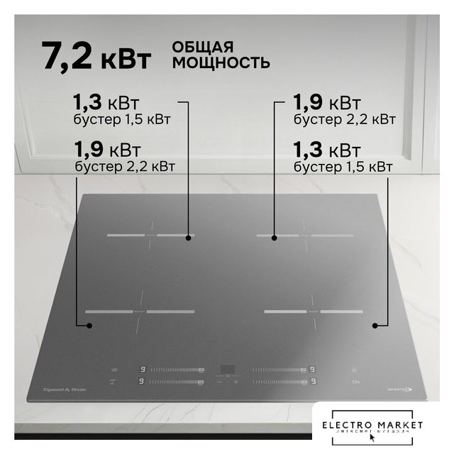 индукционная на 4 конфорки, cтеклокерамика, мощность: 7200 Вт, независимая установка, размеры (ШхГ): 59x52 см
