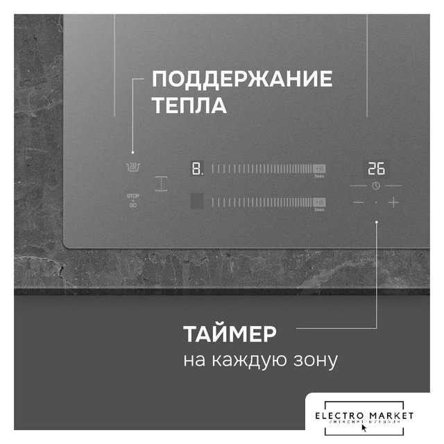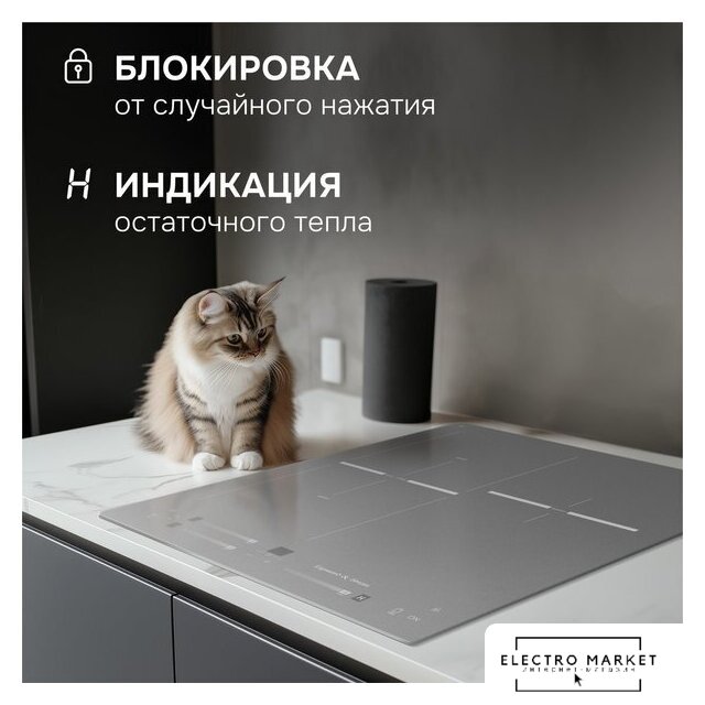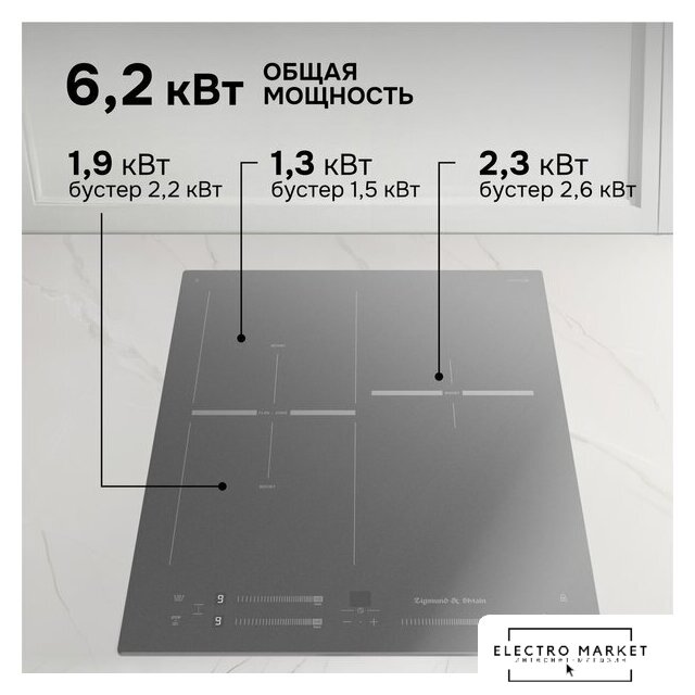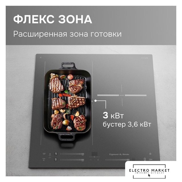 | Подробная информация о конфорках | Ближняя левая 180 мм, 1900/2200Дальняя левая 180 мм, 1300/1500Левая Flex-зона 180*380 мм, 3000/3600Дальняя правая 180 мм, 2300/2600 |