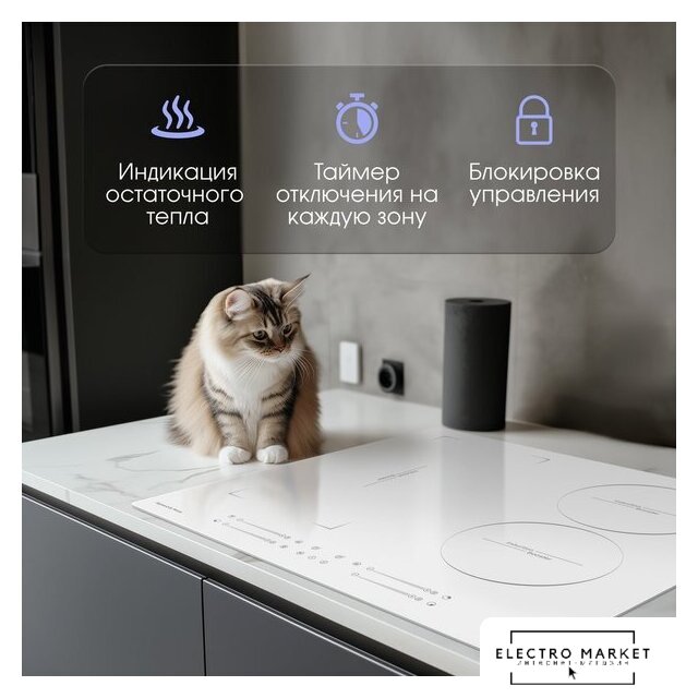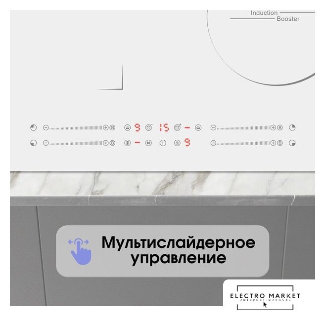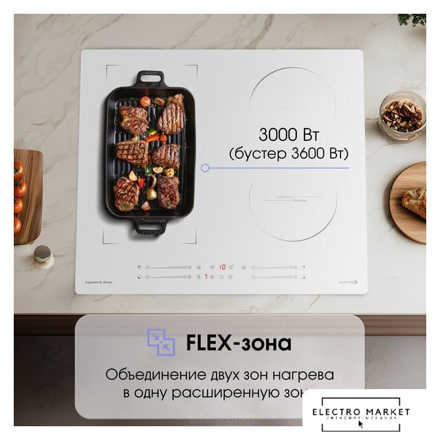| Подробная информация о конфорках | Ближняя левая 180 мм, 1800/2300Дальняя левая 160 мм, 1200/ 1500Левая Flex-зона 190*385 мм, 3000/3600Дальняя правая 180 мм, 1800/2300Ближняя правая 160 мм, 1200/ 1500 |