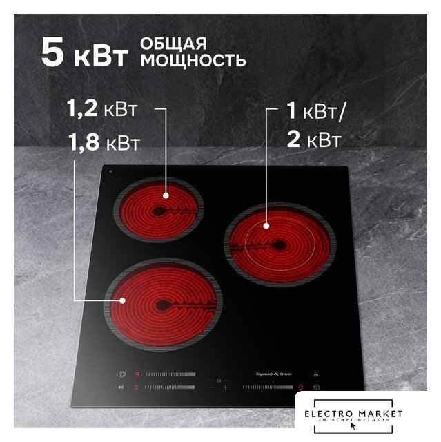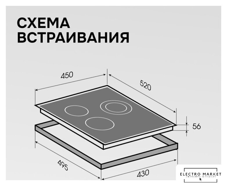 HiLight на 3 конфорки, cтеклокерамика, мощность: 5700 Вт, независимая установка, размеры (ШхГ): 58x51 см