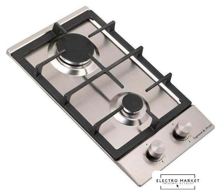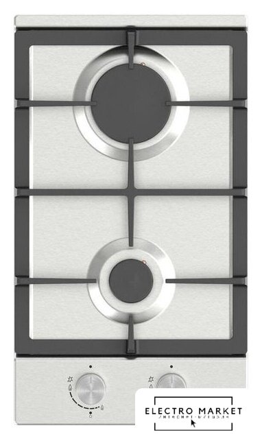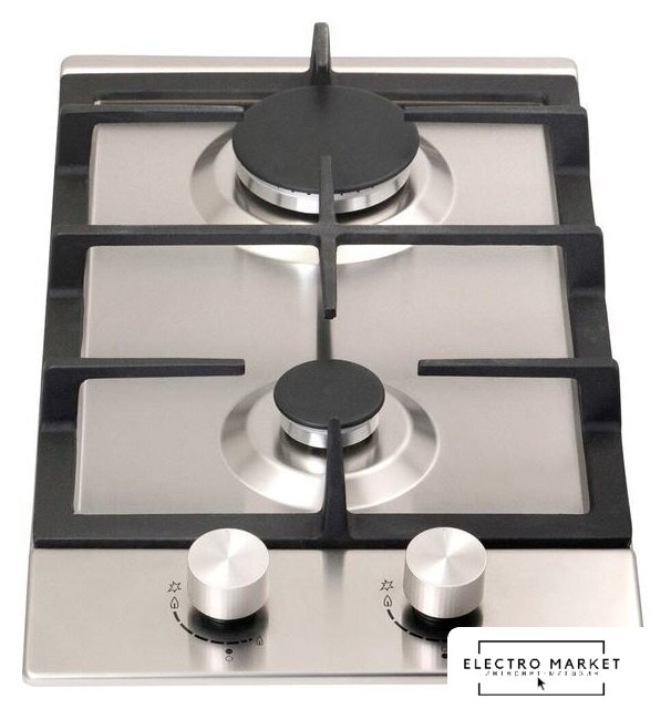газовая на 2 конфорки, закаленное стекло, мощность: 3800 Вт, автоматический электроподжиг, газ-контроль, решетки: чугун, независимая установка, размеры (ШхГ): 32x52 см