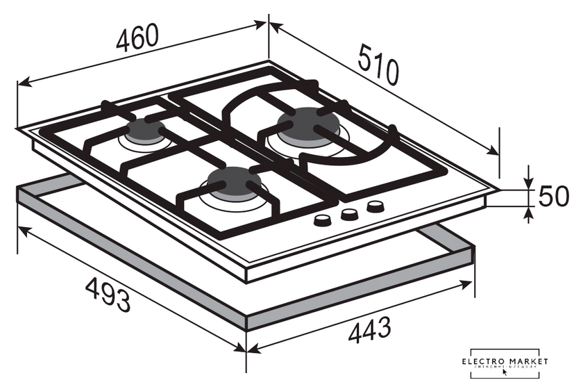 газовая на 3 конфорки, закаленное стекло, мощность: 6550 Вт, автоматический электроподжиг, газ-контроль, решетки: чугун, независимая установка, размеры (ШхГ): 45x50 см