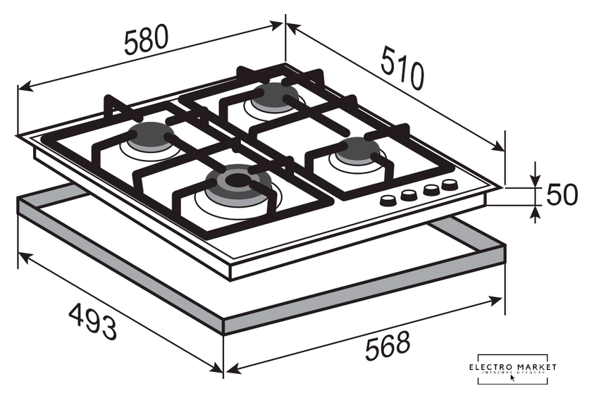 газовая на 4 конфорки, нержавеющая сталь, мощность: 8000 Вт, автоматический электроподжиг, газ-контроль, решетки: чугун, независимая установка, размеры (ШхГ): 58x50 см