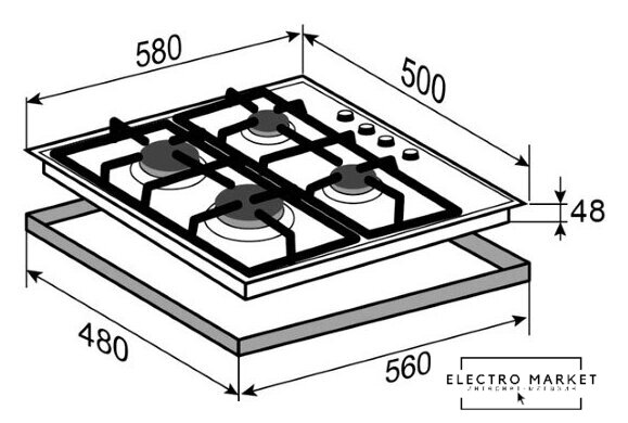 газовая на 4 конфорки, нержавеющая сталь, мощность: 8060 Вт, автоматический электроподжиг, газ-контроль, решетки: чугун, независимая установка, размеры (ШхГ): 58x50 см