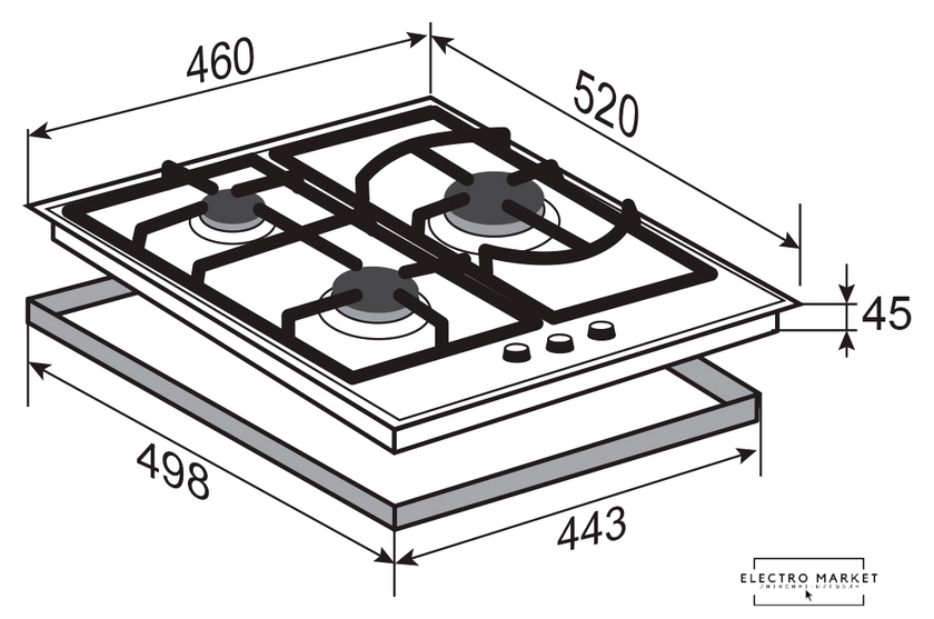 газовая на 3 конфорки, закаленное стекло, мощность: 6550 Вт, автоматический электроподжиг, газ-контроль, решетки: чугун, независимая установка, размеры (ШхГ): 44x59 см
