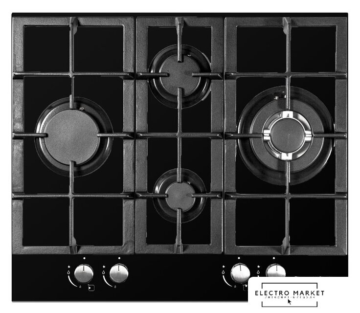 газовая на 4 конфорки, закаленное стекло, мощность: 8500 Вт, автоматический электроподжиг, газ-контроль, решетки: чугун, независимая установка, размеры (ШхГ): 60x52 см