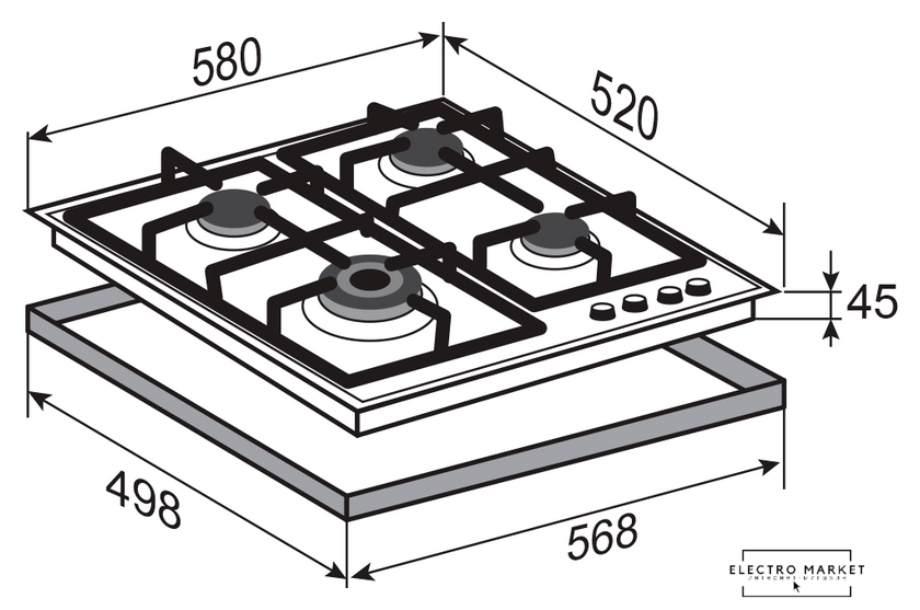 газовая на 4 конфорки, закаленное стекло, автоматический электроподжиг, газ-контроль, решетки: чугун, независимая установка, размеры (ШхГ): 59x51 см