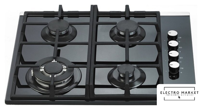 газовая на 4 конфорки, закаленное стекло, мощность: 8000 Вт, автоматический электроподжиг, газ-контроль, решетки: чугун, размеры (ШхГ): 60x51 см