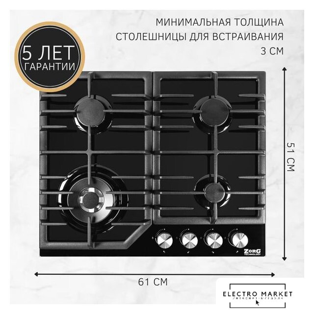 газовая на 4 конфорки, закаленное стекло, мощность: 10500 Вт, газ-контроль, решетки: чугун, независимая установка, размеры (ШхГ): 60x51 см