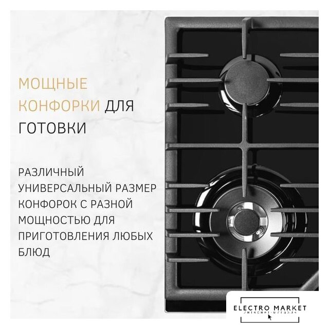 | Подробная информация о конфорках | Передняя правая конфорка: 1,7 кВтПередняя левая конфорка: 1 кВтЗадняя правая конфорка: 1,7 кВтЗадняя левая конфорка: 4 кВт |