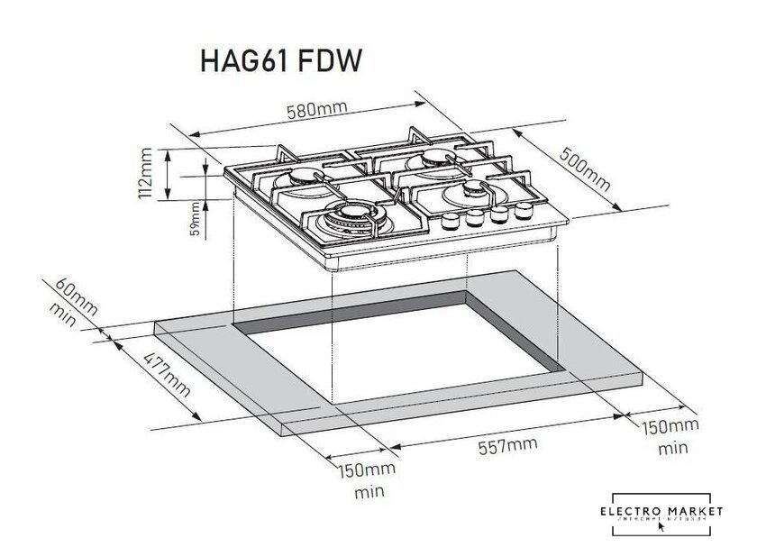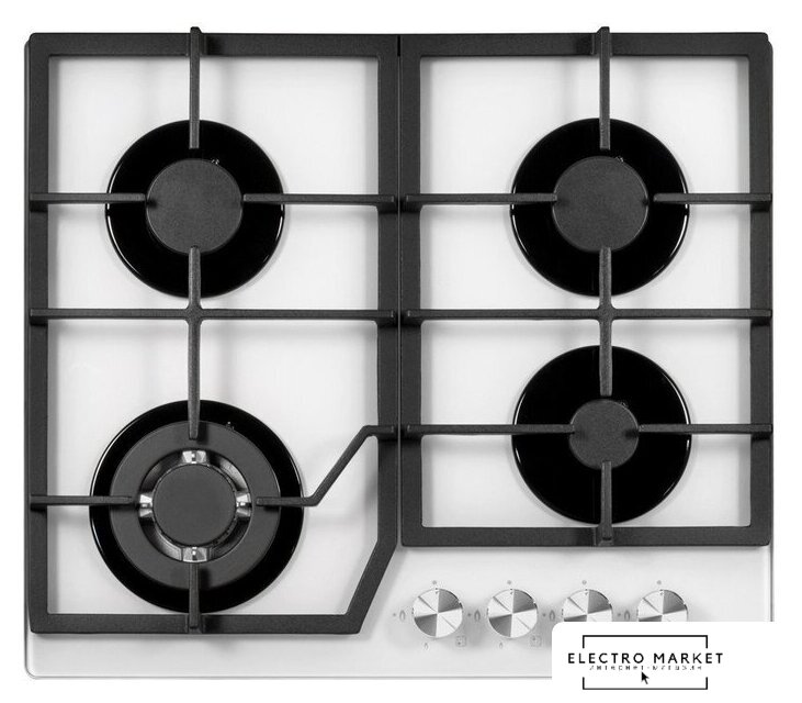 газовая на 4 конфорки, закаленное стекло, мощность: 9100 Вт, автоматический электроподжиг, газ-контроль, решетки: чугун, независимая установка, размеры (ШхГ): 59x51.5 см