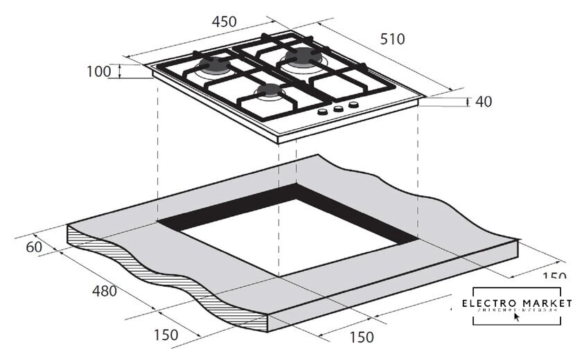 газовая на 3 конфорки, закаленное стекло, мощность: 5700 Вт, автоматический электроподжиг, газ-контроль, решетки: чугун, независимая установка, размеры (ШхГ): 44x51 см