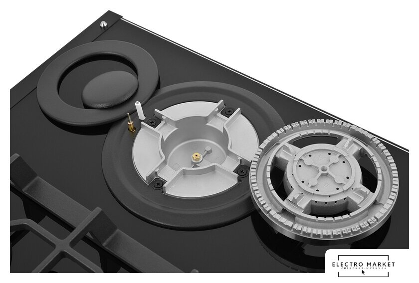 газовая на 3 конфорки, закаленное стекло, мощность: 5700 Вт, автоматический электроподжиг, газ-контроль, решетки: чугун, независимая установка, размеры (ШхГ): 52x52 см