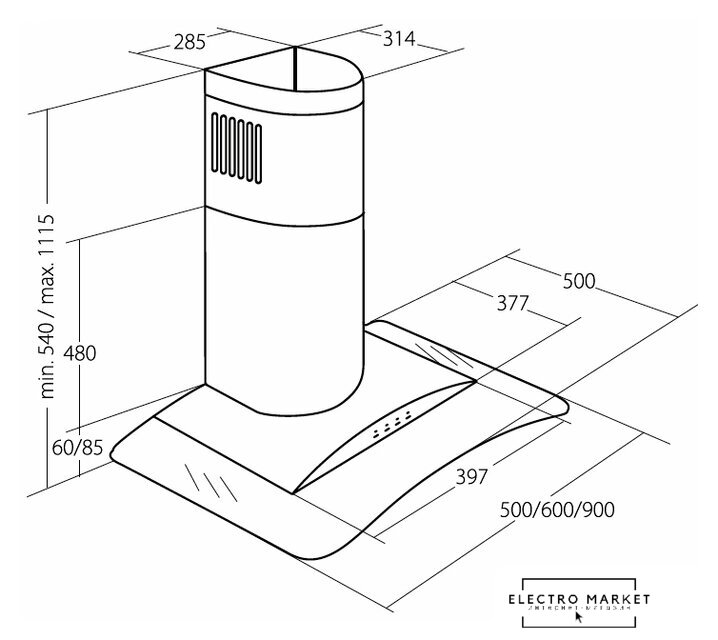 конструкция коробчатая, монтаж настенный, ширина 35 см, управление электронное/кнопочное, производительность мотора 1050 м³/ч, цвет черный