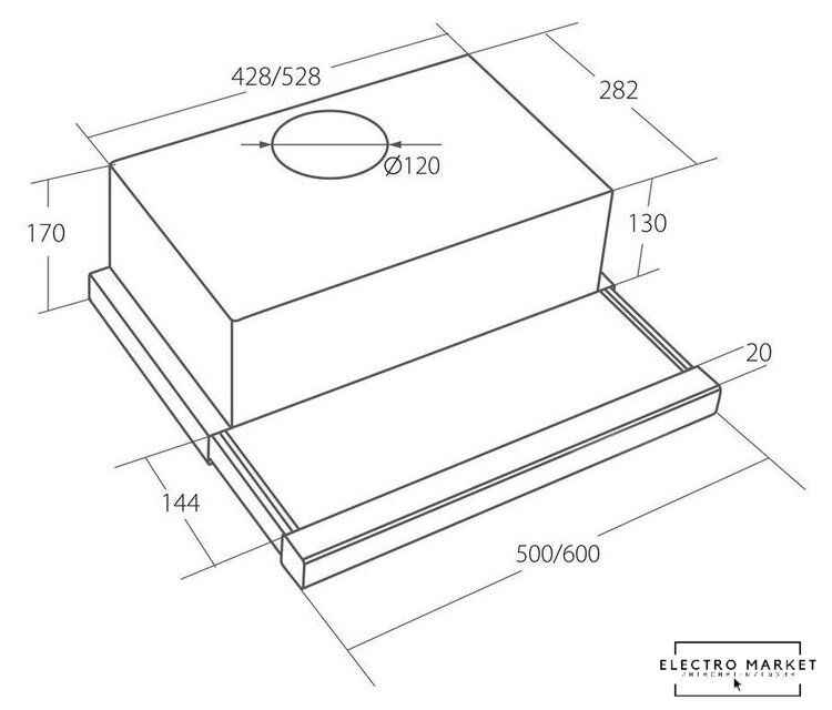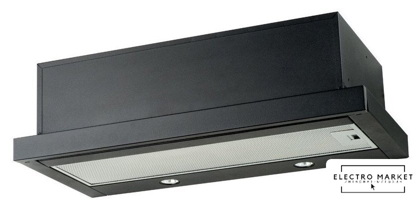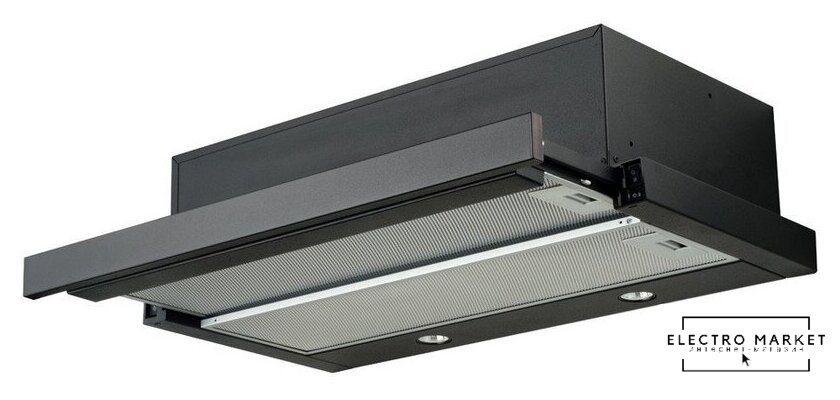 конструкция телескопическая, монтаж для встраивания, управление механическое/кнопочное, производительность мотора 650 м³/ч, ширина 59.8 см