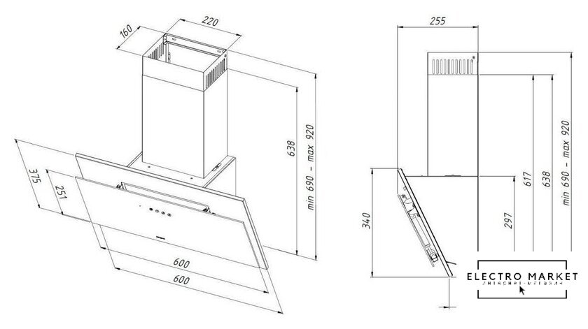 конструкция скрытая, монтаж для встраивания, ширина 52 см, управление механическое/кнопочное, производительность мотора 850 м³/ч, цвет черный