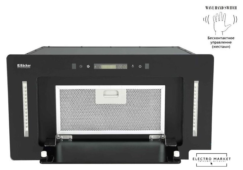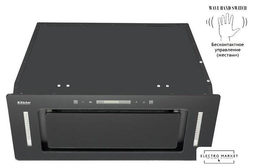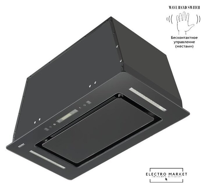 конструкция скрытая, монтаж для встраивания, ширина 52 см, управление сенсорное, производительность мотора 800 м³/ч, цвет черный