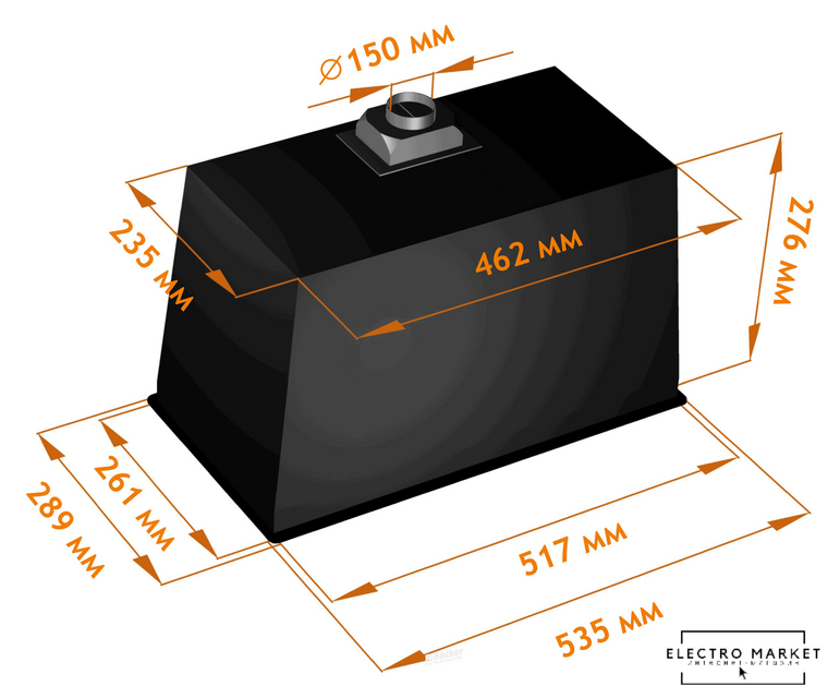 конструкция коробчатая, монтаж настенный, ширина 35 см, управление электронное/кнопочное, производительность вытяжки 850 м³/ч, производительность мотора 1050 м³/ч, цвет белый