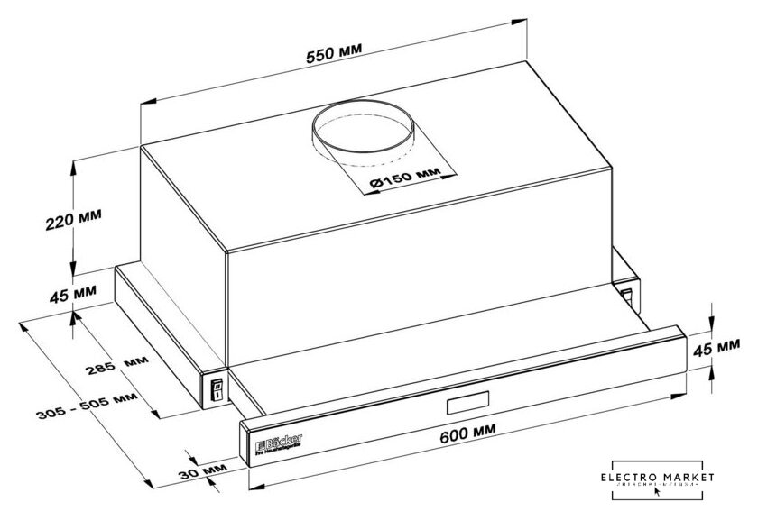 конструкция скрытая, монтаж для встраивания, ширина 52 см, управление сенсорное, цвет черный