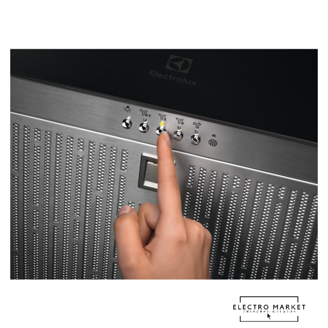 конструкция коробчатая, монтаж настенный, ширина 59.8 см, управление электронное/кнопочное, производительность вытяжки 415 м³/ч, производительность мотора 1200 м³/ч