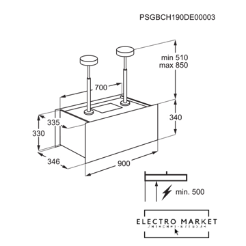 конструкция Т-образная, монтаж настенный, ширина 90 см, управление электронное/кнопочное, производительность вытяжки 641 м³/ч, производительность мотора 800 м³/ч, цвет нержавеющая сталь