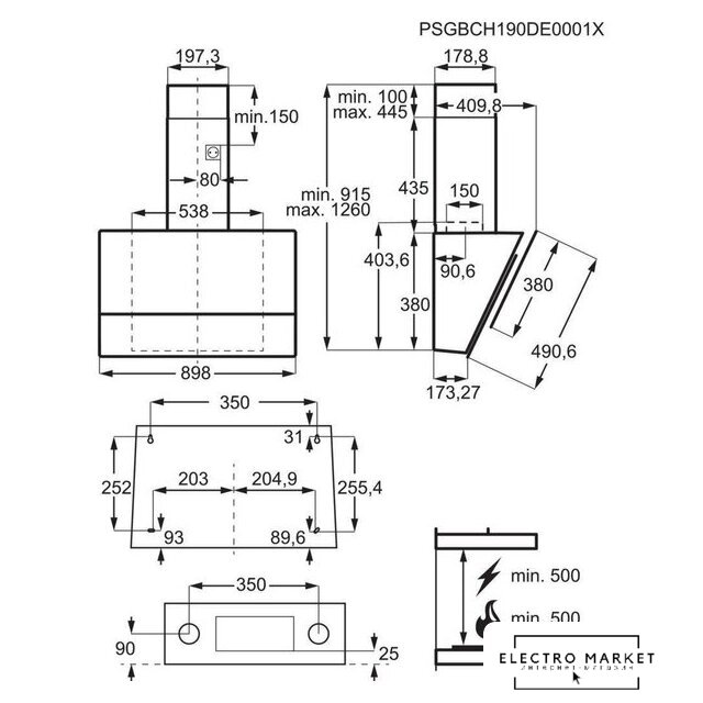 конструкция наклонная, монтаж настенный, ширина 85 см, управление электронное/кнопочное, производительность вытяжки 500 м³/ч, цвет нержавеющая сталь/черный