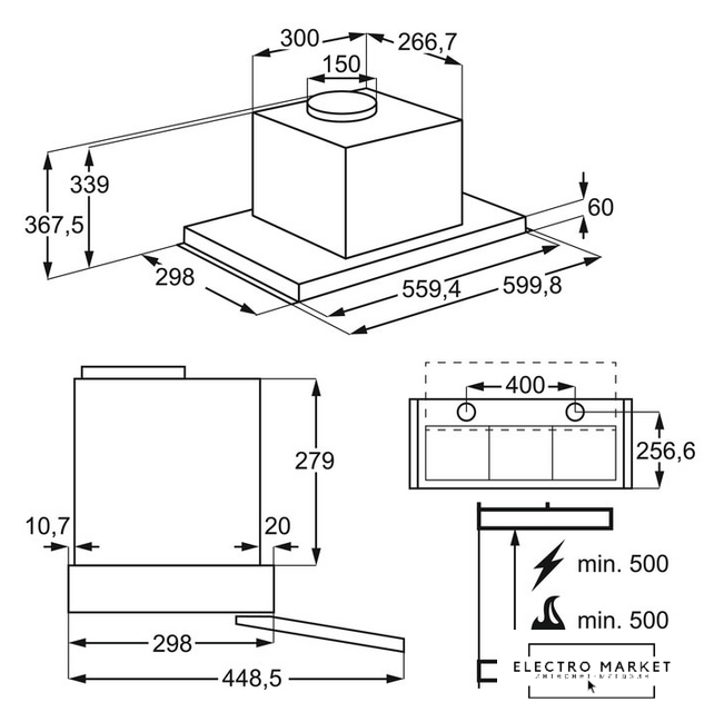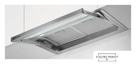 конструкция скрытая, монтаж для встраивания, ширина 54 см, управление электронное/кнопочное, производительность вытяжки 365 м³/ч, цвет белый