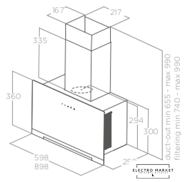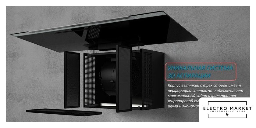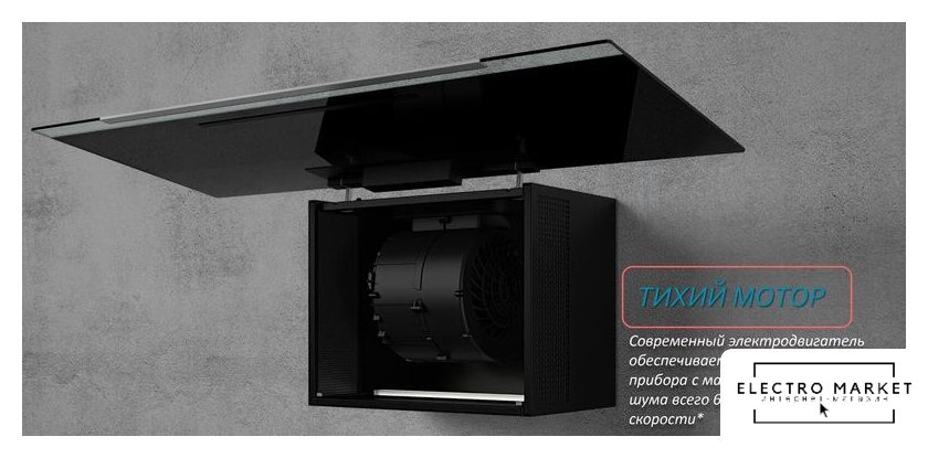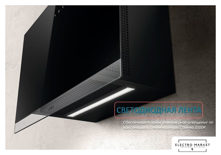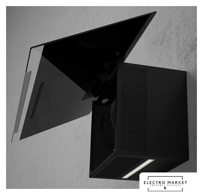 конструкция купольная, монтаж настенный, ширина 89.8 см, управление слайдерное, производительность вытяжки 588 м³/ч, цвет черный
