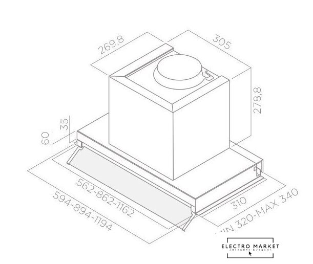 конструкция коробчатая, монтаж настенный, ширина 35.15 см, управление электронное/кнопочное, производительность мотора 1050 м³/ч, цвет черный