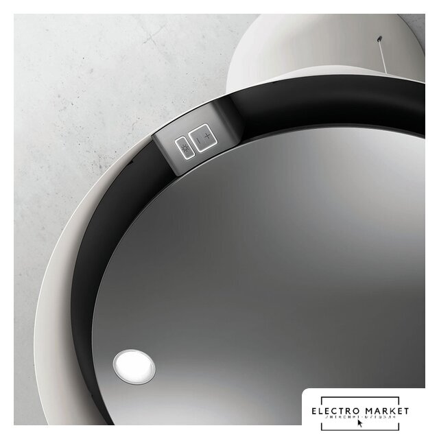 конструкция Т-образная, монтаж островной, ширина 90 см, управление сенсорное, производительность вытяжки 420 м³/ч, цвет черный