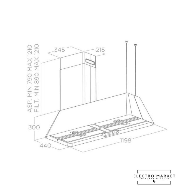 конструкция скрытая, монтаж островной/для встраивания, ширина 100 см, управление электронное, производительность вытяжки 570 м³/ч, производительность мотора 1200 м³/ч, цвет нержавеющая сталь