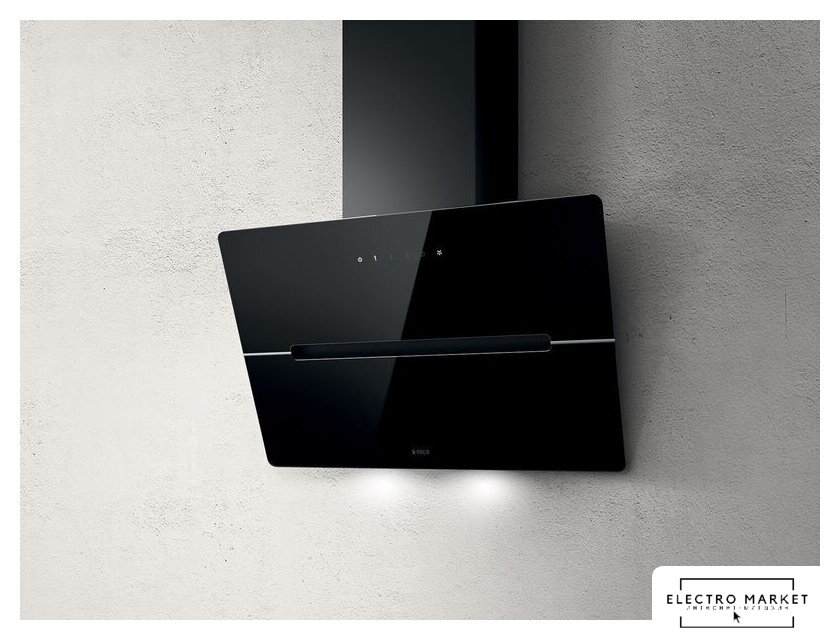 конструкция наклонная, монтаж настенный, ширина 90 см, управление сенсорное, производительность мотора 1270 м³/ч, цвет черный