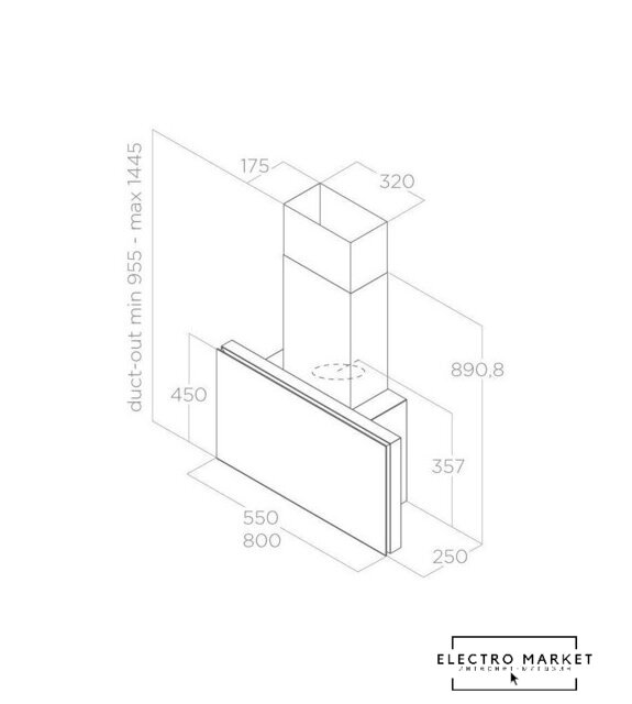конструкция скрытая, монтаж для встраивания, ширина 82 см, управление электронное/кнопочное, производительность вытяжки 600 м³/ч, цвет нержавеющая сталь