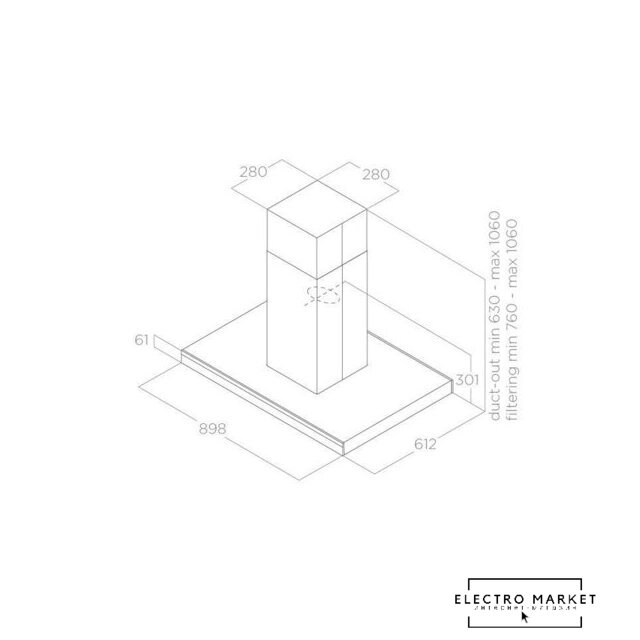 конструкция купольная, монтаж настенный, управление механическое/поворотный переключатель, производительность вытяжки 630 м³/ч, ширина 89.6 см