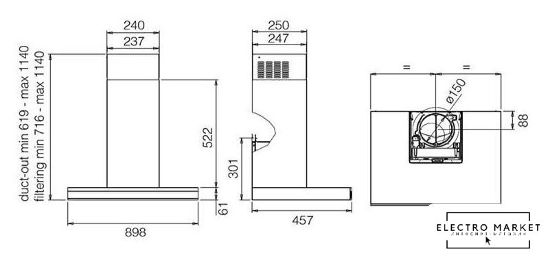 конструкция скрытая, монтаж для встраивания, ширина 59.4 см, управление электронное/кнопочное, производительность вытяжки 365 м³/ч, цвет нержавеющая сталь